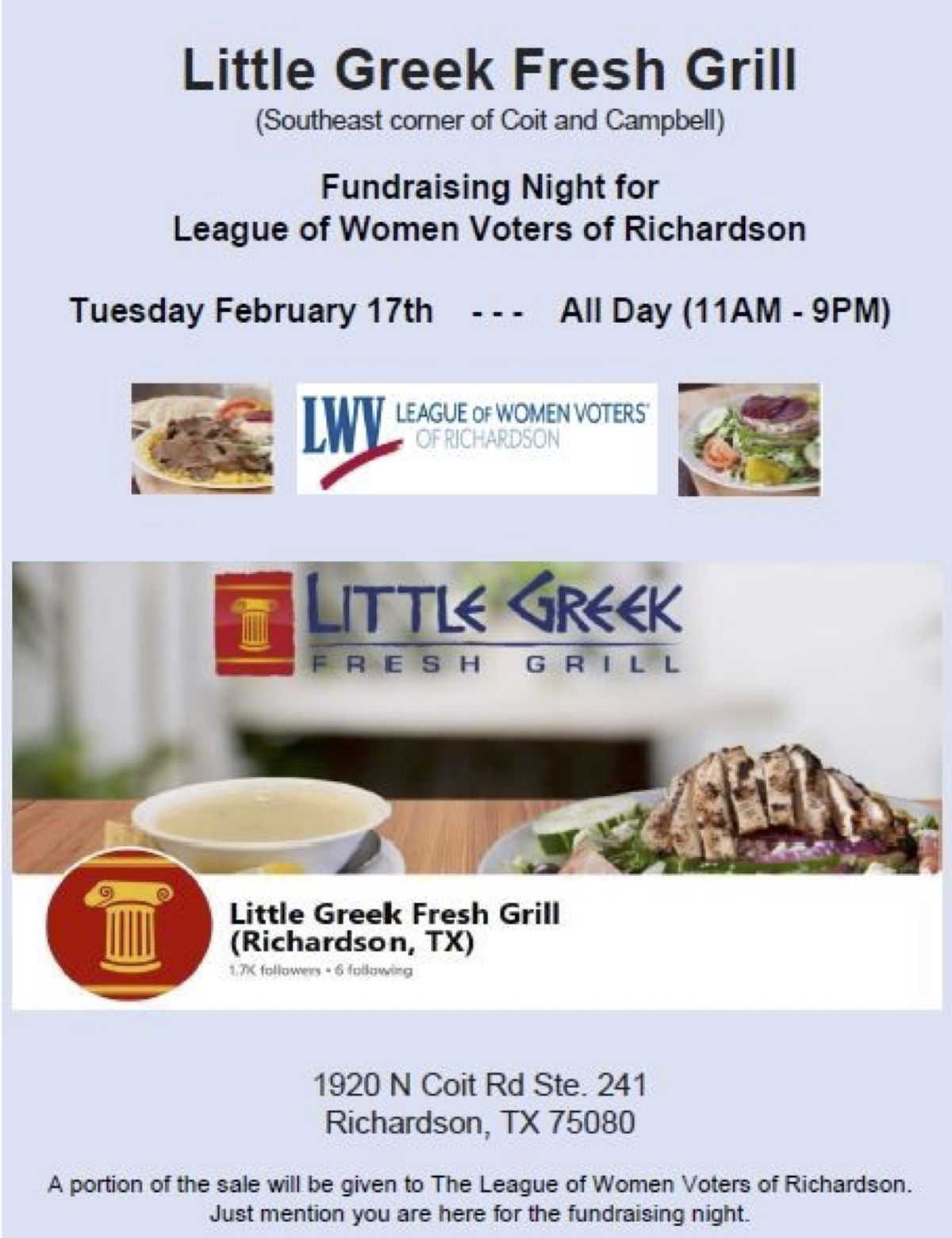 | All members, prospective members, and friends of the League of Women Voters of Richardson are invited to our February social. It will be on Tuesday, February 17th at 6:30 p.m. at Little Greek (SE corner of Coit & Campbell) . This is also a fundraiser. Tell your friends because the League will receive a portion of sales all day long for all patrons showing the flyer or mentioning the League of Women Voters of Richardson.