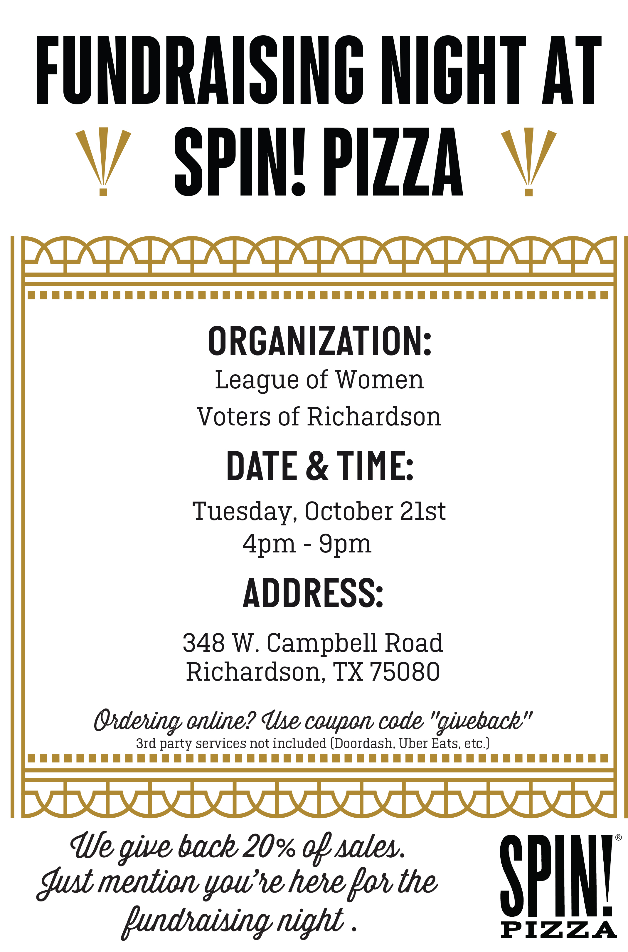 | All members and friends of the League of Women Voters of Richardson are invited to our October social. It will be on Tuesday, October 21st, starting at 6:30PM at Spin! Pizza.