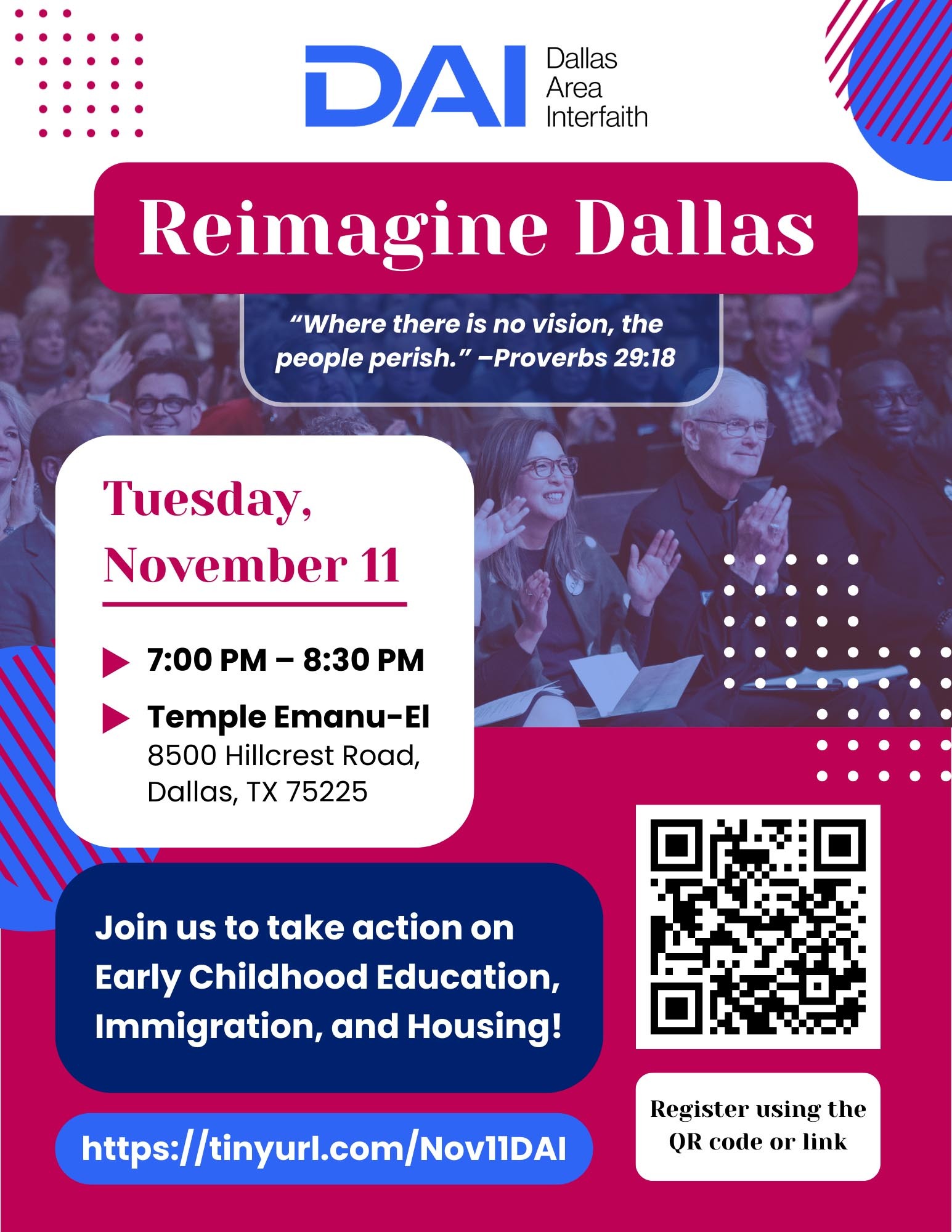 "Reimagine Dallas" is a large-scale community action organized by Dallas Area Interfaith.  Residents, clergy, and civic leaders from across the city will be gathered together to "Reimagine" Dallas through collective action on